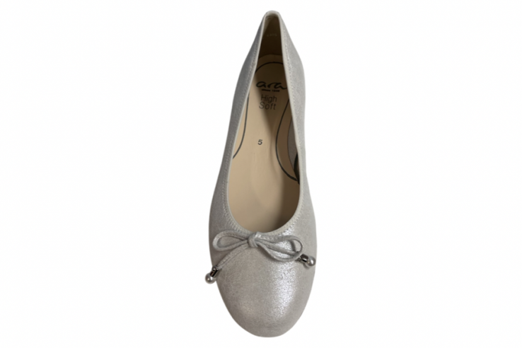 Ara, en fin och stilren ballerina i skinn med en dekorativ rosett fram som slutar med en vit pärla. Färgen är lite off White och skimrar lite i ljuset. En perfekt sko för lite finare tillställningar som kräver en skön sko dessutom, varför inte bröllop! Den mjuka innersulan som är uppbyggd i hålfoten ger skon en skön komfort och klackhöjden är 1cm. Den är normal i storlek och passar en normalbred fot