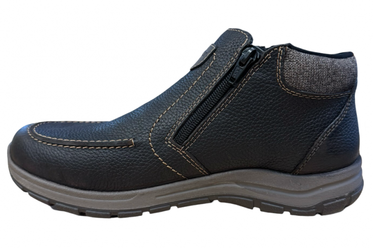 Rieker, en vattentät, ull fodrad boots i skinn med två dragkedjor för att enkelt kunna ta av och på skon. Den har en löstagbar innersula som är filtklädd för att ge bra värme och en mönstrad slitsula. Lästen ger extra vidd och är normal i storlek. Tänk på att måtten är en riktlinje och kan diffa på några millimeter.