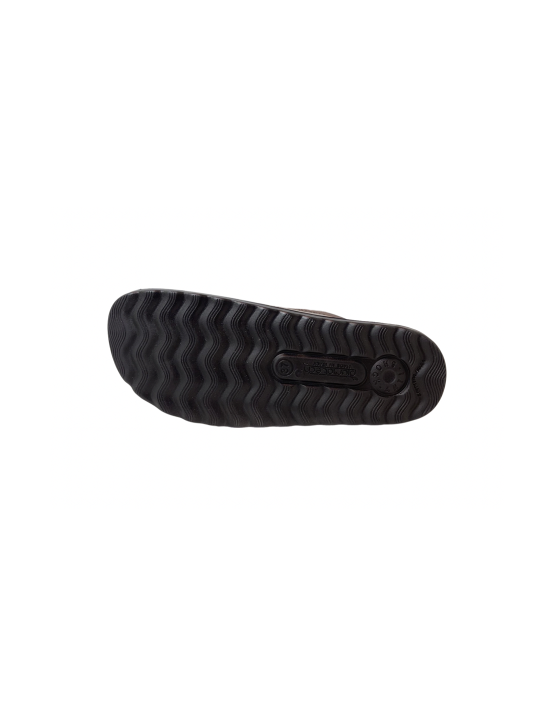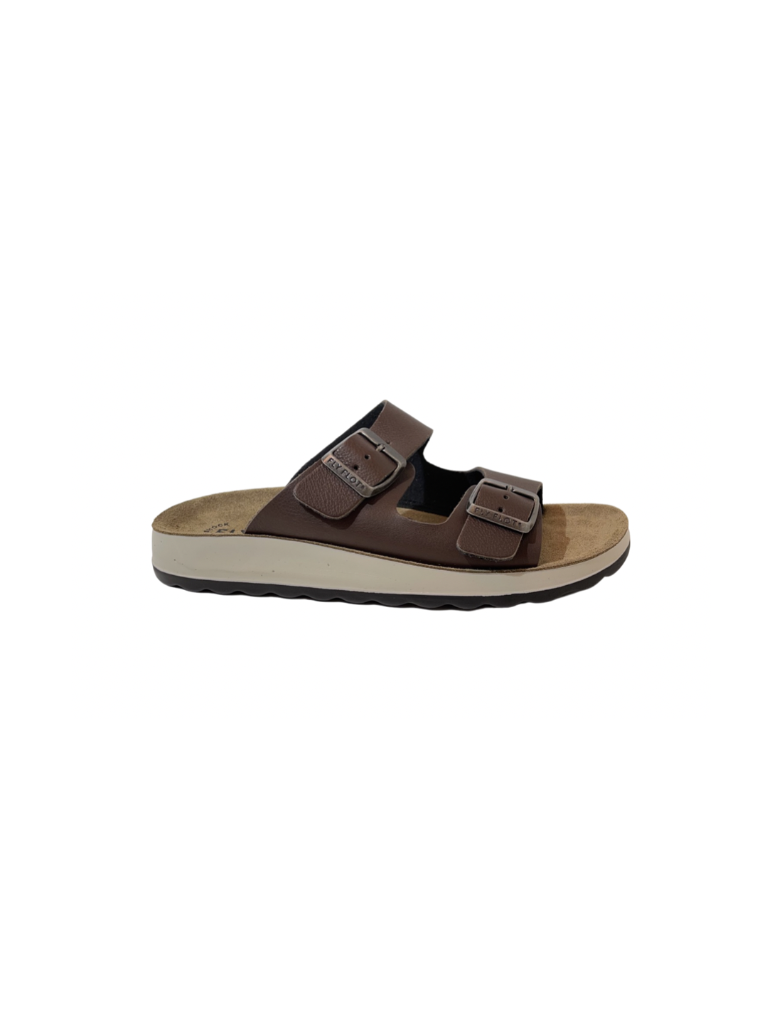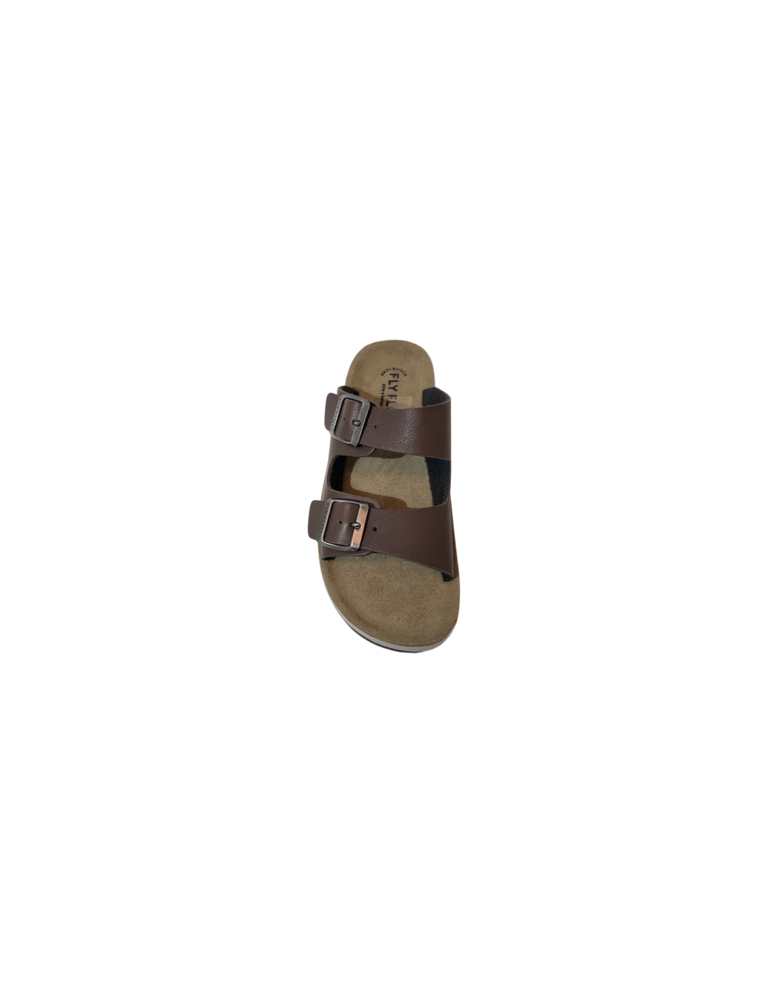 Fly Flot, en sandal med skinn ovandel och två ställbara band över foten. Den har en mjuk anatomisk fotbädd som har lite uppbyggnad under det främre fotvalvet med en liten pelott. Den är lite stor i storlek, ca ett ½ nummer. I och med de ställbara remmarna så passar den allt från en lite smalare till lite bredare fot.