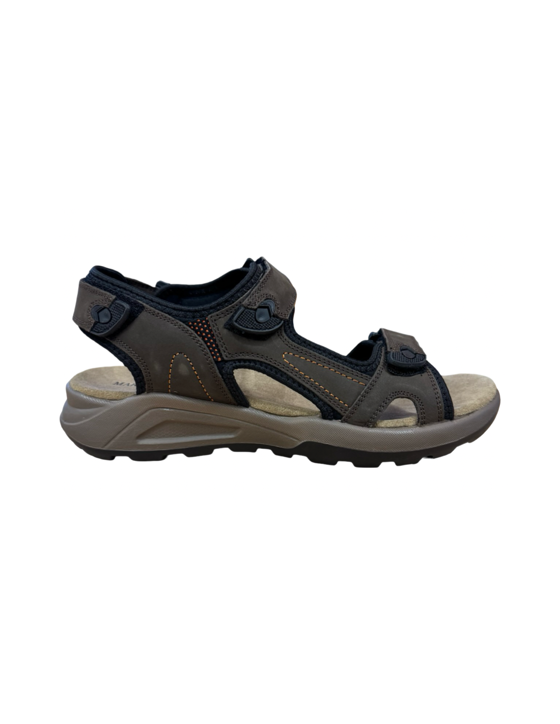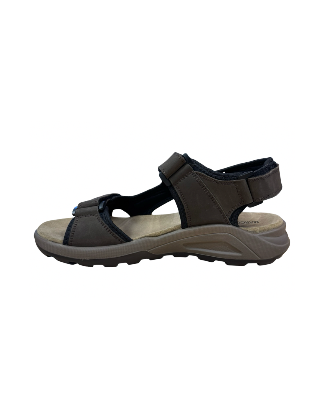 MarcoBossi, sandaler med 3 ställbara remmar med kardborre. Den har en mjukt och dämpad innersula med uppbyggt stöd för hålfoten som även är löstagbar för ev. egna fotbäddar. En komfortsandal som passar för sommarens promenader eller som arbetsskor. Normal storlek.