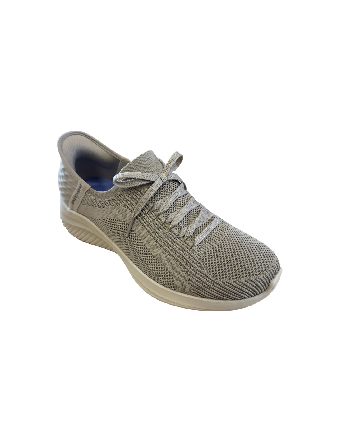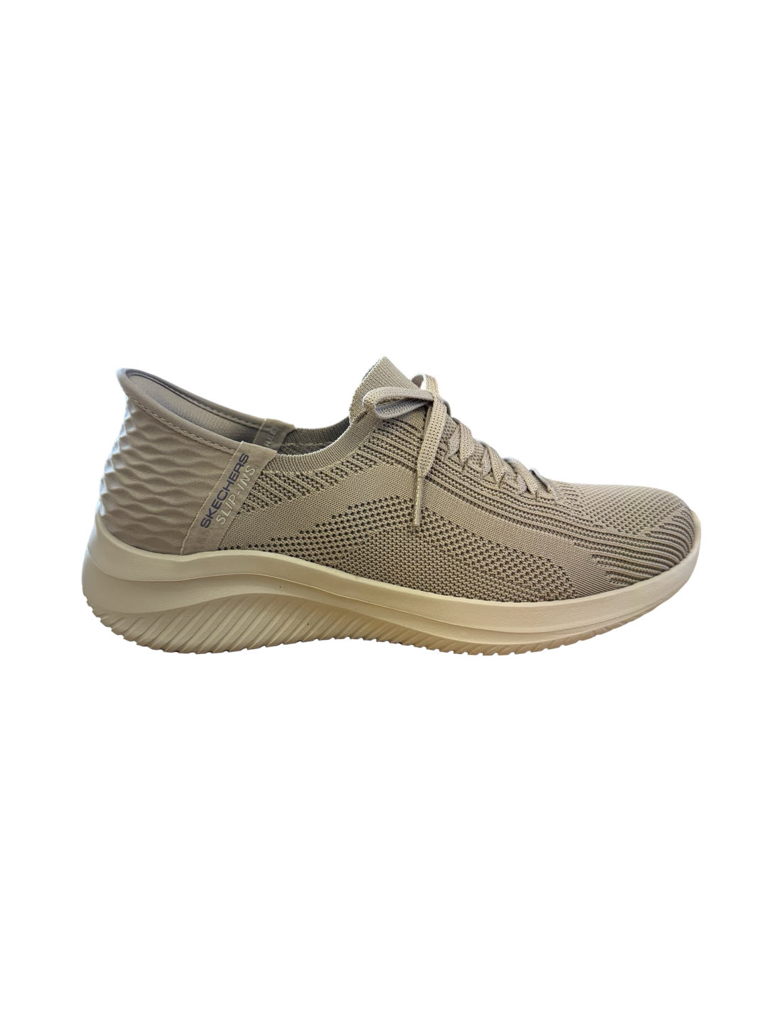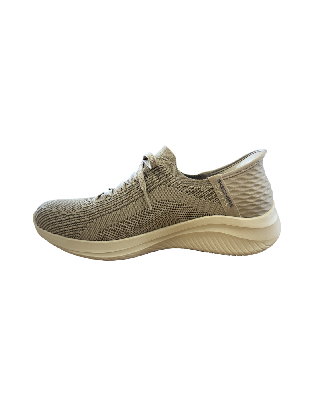 Skechers Hands Free Slip-ins® Ultra Flex 3.0 är en slip-on-sko med en elastisk Ultra Stretch Fit®-ovandel och fasta dekorativa snören. Skon har en Skechers Air-Cooled Memory Foam®-innersula för dämpad komfort. Materialet är ett mjukt tyg som känns som en strumpa, och No Tie Fit™ säkerställer att skosnörena aldrig går upp. Skon är tillverkad av 100 % veganska material, har en flexibel yttersula med bra grepp, cirka 3cm klackhöjd och kan tvättas i maskin max 30 grader, vilket gör den både bekväm och praktisk för dagligt bruk. Tänk på att måtten nedan är riktlinjer och kan diffa någon millimeter.