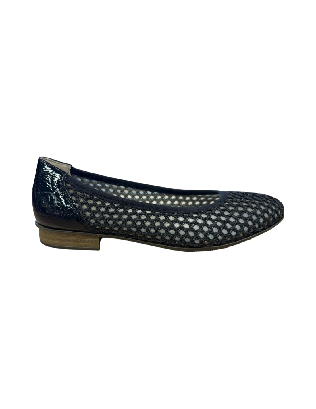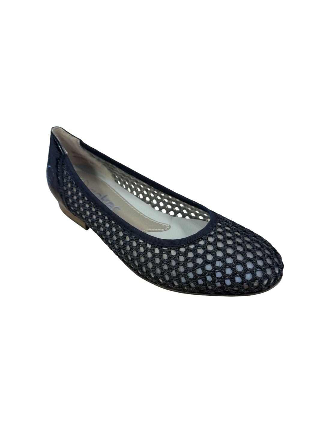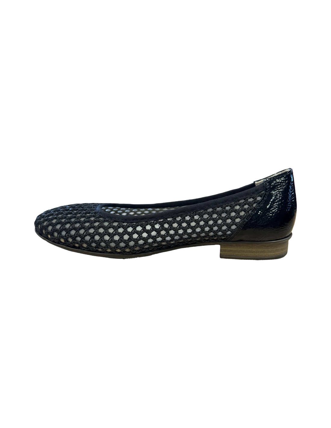 Rieker, en ballerina i svart nät med Riekers klassiska mjuka innersula, den är punktlimmad men går att dra lös för ev. egna fotbäddar. Klackhöjd på ca 1,5cm. Tänk på att måtten nedan är riktlinjer och kan diffa någon millimeter.